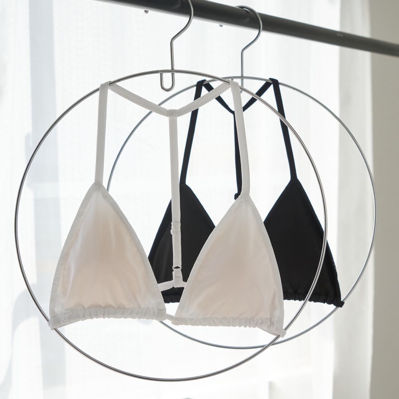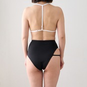 背中で一本に繋がるTバック仕様が、後ろ姿にもモードなアクセントを加えます。